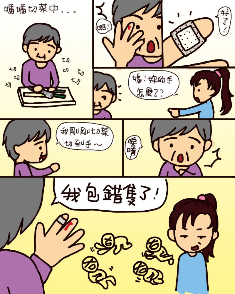 後來姊姊說那是被抽油煙機的風扇絞到手指頭,好痛喔!